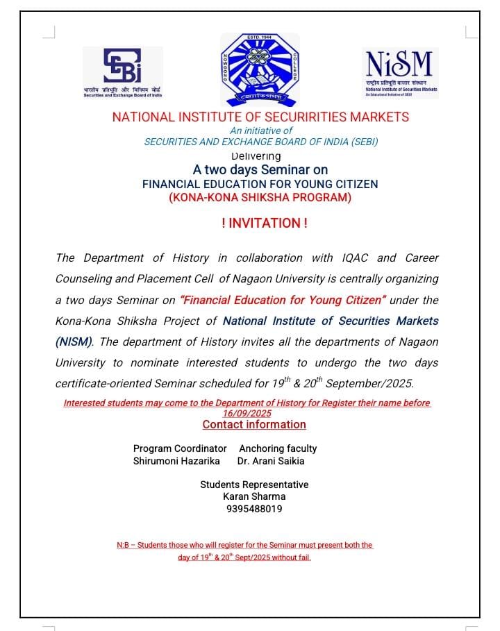 | Report of the ICSSR Sponsored National Seminar organised by Department of History, Nowgong College(Autonomous) | ICSSR sponsored two-day national seminar on 'Cultural Heritage of the North-Eastern Region for Self-Reliant India: Challenges and Opportunities' was organised by Department of History in November,2023 | 2023-11-04 | View File |